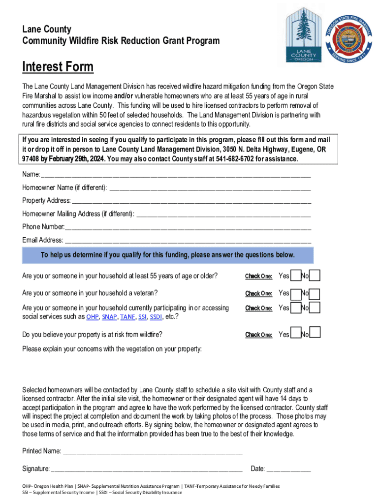 This form is intended for low income and vulnerable homeowners in Lane County, aged 55 and older, to express interest in a grant program for wildfire hazard mitigation funded by the Oregon State Fire Marshal. The program will support the removal of hazardous vegetation around eligible properties.