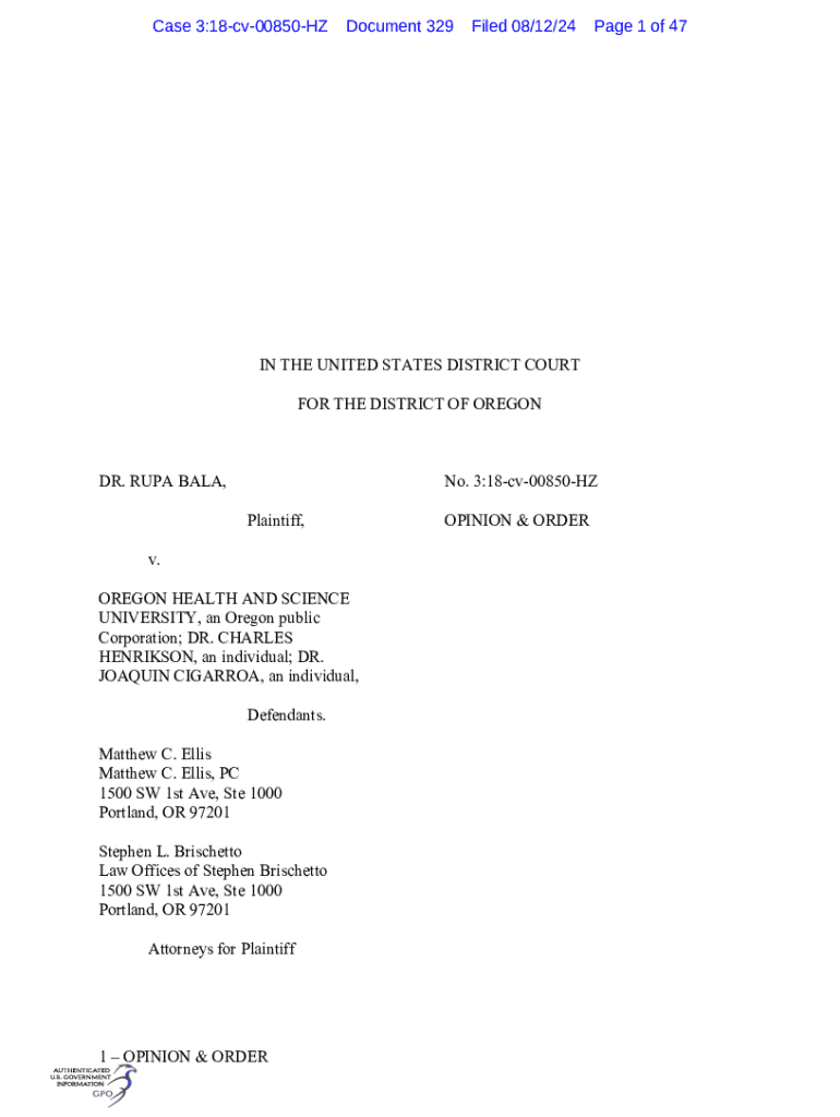 This document outlines the U.S. District Court\'s decision on Dr. Rupa Bala\'s employment discrimination lawsuit against Oregon Health and Science University and two individuals. It discusses the motions for costs and attorney fees filed by the plaintiff following a jury verdict in her favor. The document details the background of the case, including claims brought by the plaintiff, procedural history, the basis for awarding costs and fees, and the amounts awarded by the court.
