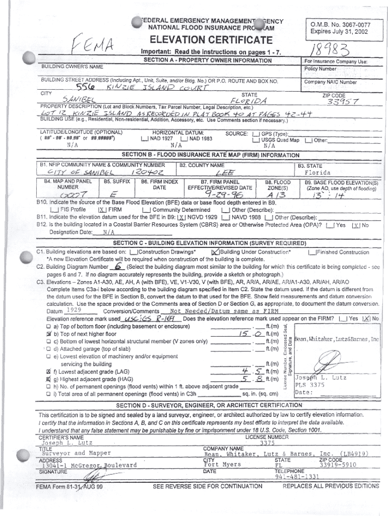 EDERAL EMERGENCYMANAGEMENTNATIONAL FLOODINSURANCE.ENCYO. M. B. No. 3067 0077PRAMExpires July 31, 2002ELEVATION CERTIFICATE Important:A PROPERTYSECTION BUILDINGOWNER\' S NAMEBUILDINGSTREETRead the