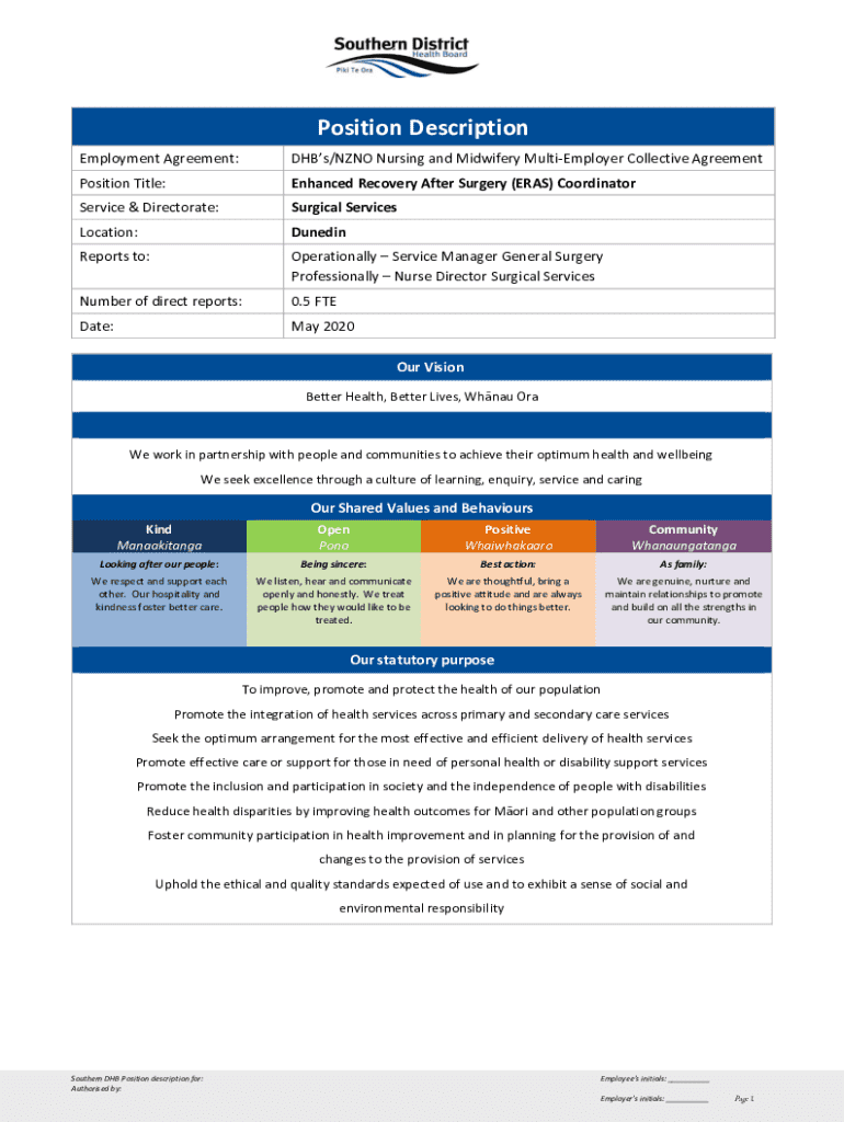 This document outlines the responsibilities, qualifications, and competencies required for the Enhanced Recovery After Surgery (ERAS) Coordinator position within Southern DHB\'s Surgical Services. It details the role\'s purpose, key relationships, essential and desirable knowledge and skills, and key result areas aimed at improving patient outcomes through the ERAS program.