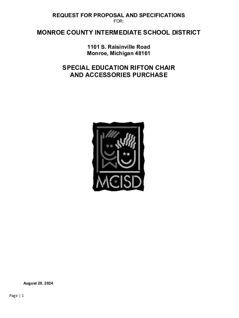 REQUEST FOR PROPOSAL AND SPECIFICATIONS FOR:MONROE COUNTY INTERMEDIATE SCHOOL DISTRICT 1101 S. Raisinville Road Monroe, Michigan 48161SPECIAL EDUCATION RIFTON CHAIR AND ACCESSORIES PURCHASEAugust