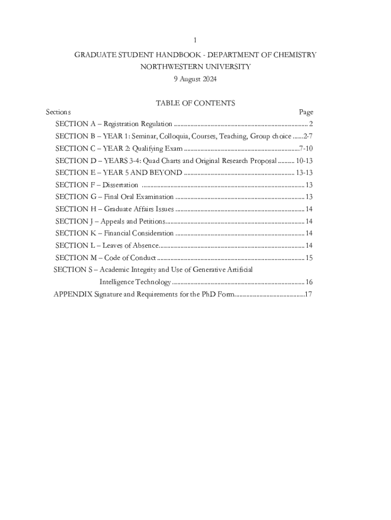 1 GRADUATE STUDENT HANDBOOK DEPARTMENT OF CHEMISTRY NORTHWESTERN UNIVERSITY 9 August 2024SectionsTABLE OF CONTENTSPageSECTION A Registration Regulation ................................................................................