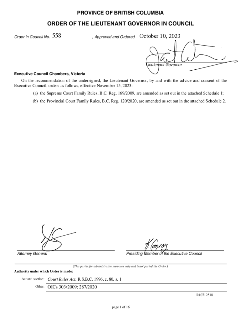 PROVINCE OF BRITISH COLUMBIAORDER OF THE LIEUTENANT GOVERNOR IN COUNCIL Order in Council No.558, Approved and OrderedOctober 10, 2023Lieutenant Governor Executive Council Chambers, VictoriaOn the