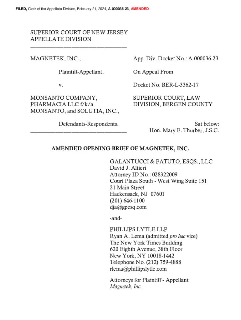 FILED, Clerk of the Appellate Division, February 21, 2024, A00003623, AMENDEDAMENDEDSUPERIOR COURT OF NEW JERSEY APPELLATE DIVISION ___ MAGNETEK, INC.,App. Div. Docket No.: A00003623PlaintiffAppellant,On