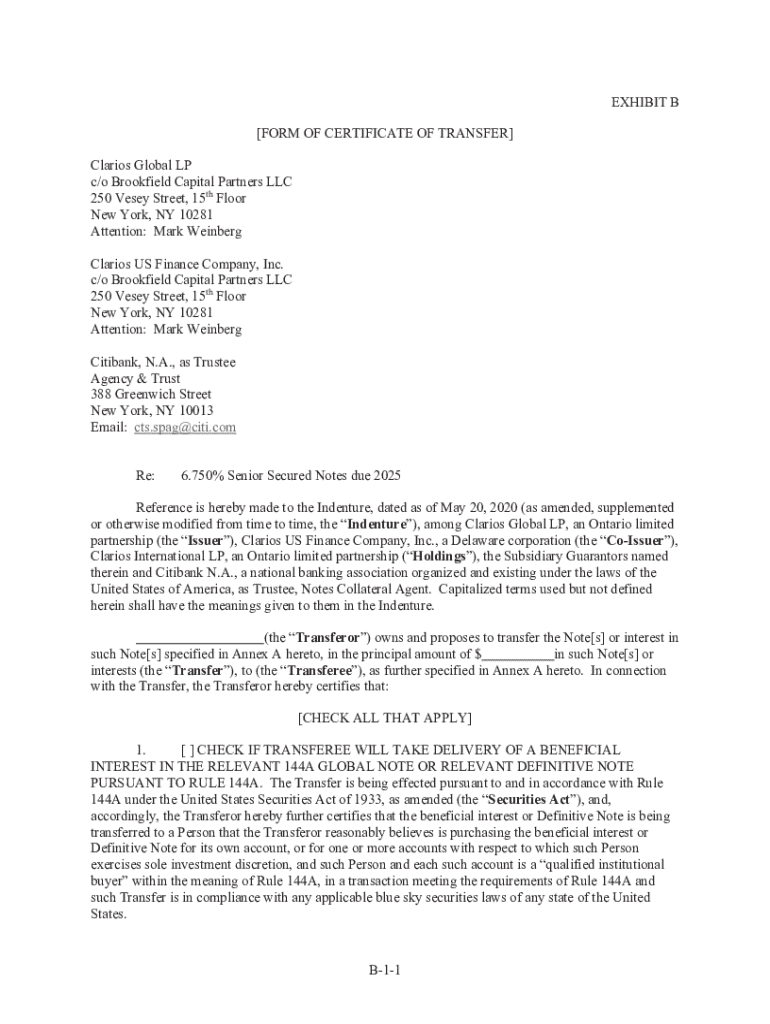 Get the free B-1-1 EXHIBIT B FORM OF CERTIFICATE OF TRANSFER Clarios ...