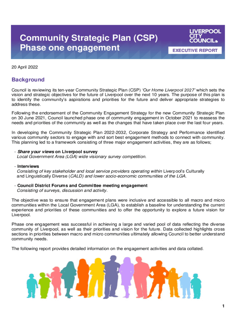 This report outlines the phase one engagement activities undertaken by the Council to reassess community needs and priorities for the Community Strategic Plan 2022-2032. It details the outreach methods used, including surveys, interviews, and district forums, to gather a diverse pool of data reflecting the aspirations and concerns of Liverpool\'s community. The report also analyzes the feedback received and highlights key priorities for improving the liveability of the city.