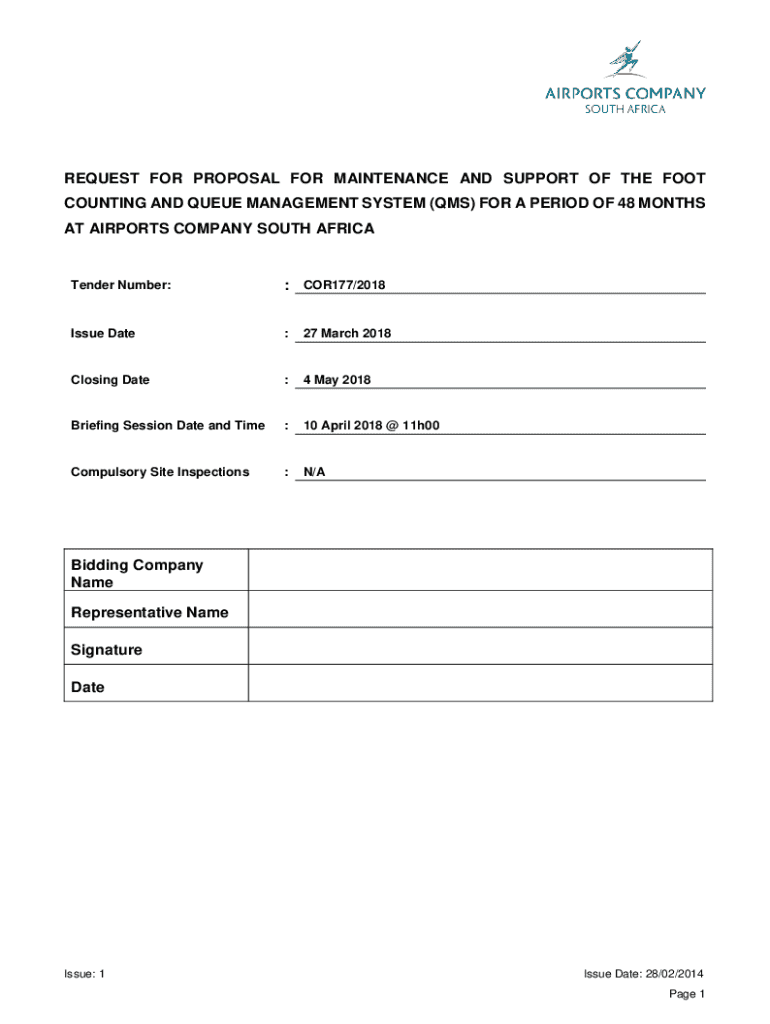 This document outlines the request for proposal (RFP) from Airports Company South Africa (ACSA) for the maintenance and support of the Foot Counting and Queue Management System for a period of 48 months. It includes instructions to bidders, background information, scope of work, evaluation criteria, and submission requirements.