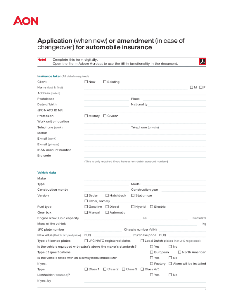 Application (when new) or amendment (in case of changeover) for automobile insurance Note!Complete this form digitally. Open the file in Adobe Acrobat to use the fillin functionality in the document.Insurance