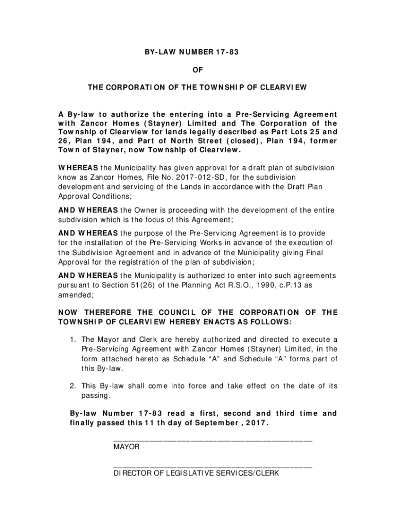 BYLAW NUMBER 1783 OF THE CORPORATION OF THE TOWNSHIP OF CLEARVIEW A Bylaw to authorize the entering into a PreServicing Agreement with Zancor Homes (Stayner) Limited and The Corporation of the Township