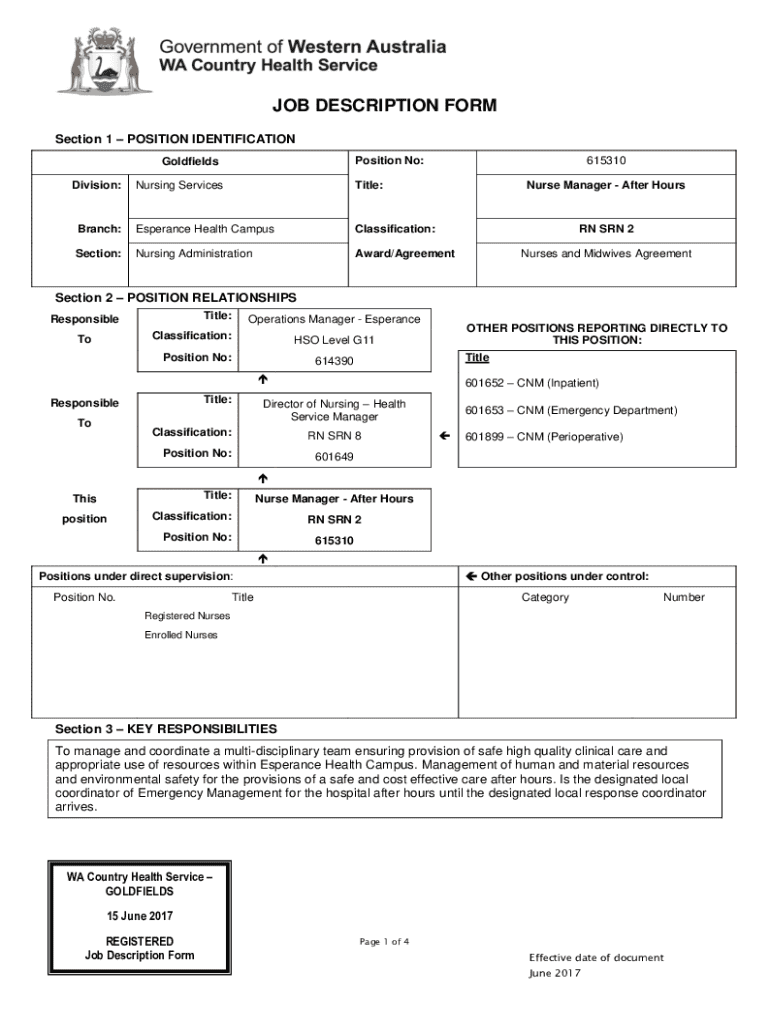 JOB DESCRIPTION FORM Section 1 POSITION IDENTIFICATION Position No:Goldfields Division:615310Nursing ServicesTitle:Nurse Manager After HoursBranch:Esperance Health CampusClassification:Section:Nursing
