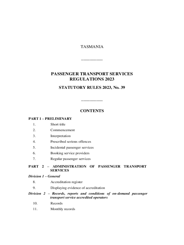 TASMANIA ___PASSENGER TRANSPORT SERVICES REGULATIONS 2023 STATUTORY RULES 2023, No. 39 ___ CONTENTS PART 1 PRELIMINARY 1.Short title2.Commencement3.Interpretation4.Prescribed serious offences5.Incidental