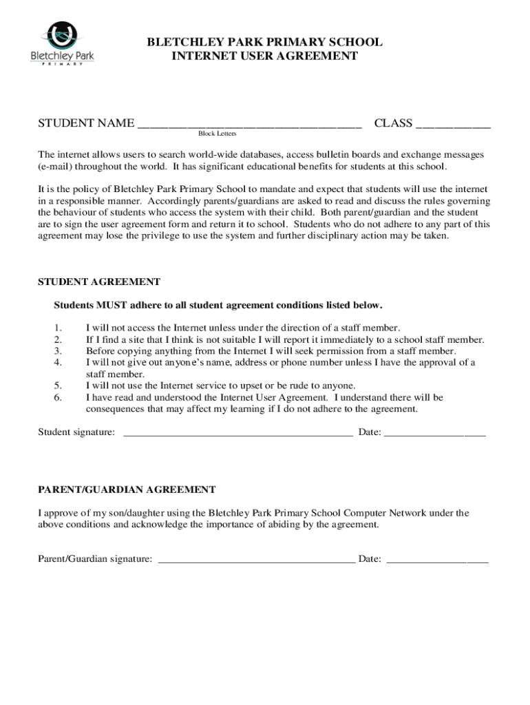 BLETCHLEY PARK PRIMARY SCHOOL INTERNET USER AGREEMENTSTUDENT NAME ___ CLASS ___ Block LettersThe internet allows users to search worldwide databases, access bulletin boards and exchange messages (email)