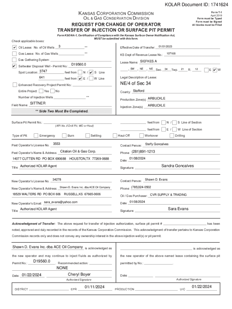 KOLAR Document ID: 1741624K ANSAS CORPORATION COMMISSIONForm T1 April 2019 Form must be Typed Form must be Signed All blanks must be FilledOIL & GAS CONSERVATION DIVISION REQUEST FOR CHANGE OF OPERATOR