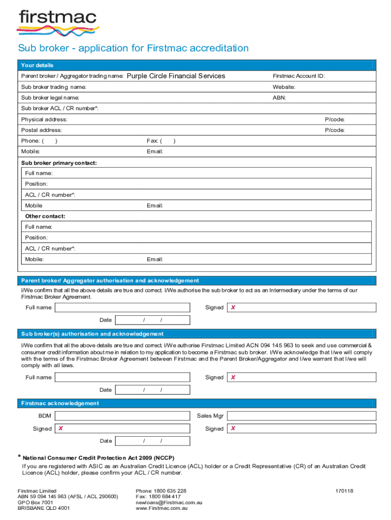 This document is an application form for sub brokers seeking accreditation with Firstmac. It includes fields for broker details, contact information, acknowledgments, and authorizations necessary for compliance with Firstmac\'s Broker Agreement.