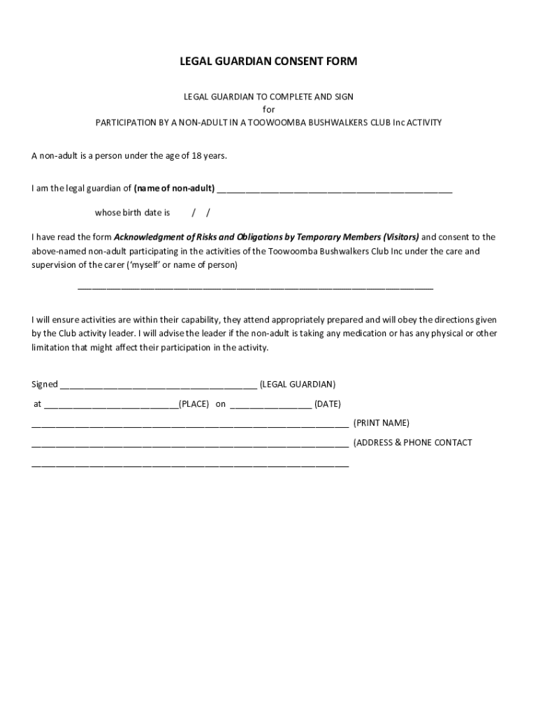 This form is to be completed and signed by a legal guardian, granting consent for a non-adult to participate in activities organized by the Toowoomba Bushwalkers Club Inc. It outlines the guardian\'s responsibilities and the acknowledgment of risks involved.