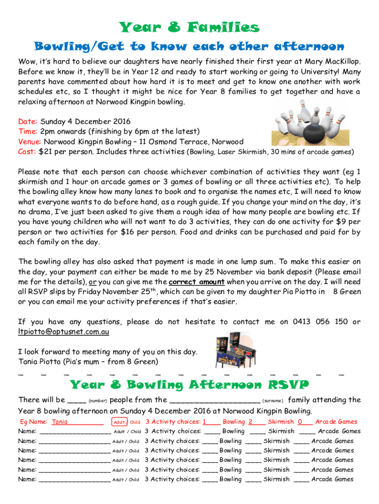 Year 8 Families Bowling/Get to know each other afternoon Wow, its hard to believe our daughters have nearly finished their first year at Mary MacKillop. Before we know it, theyll be in Year 12 and