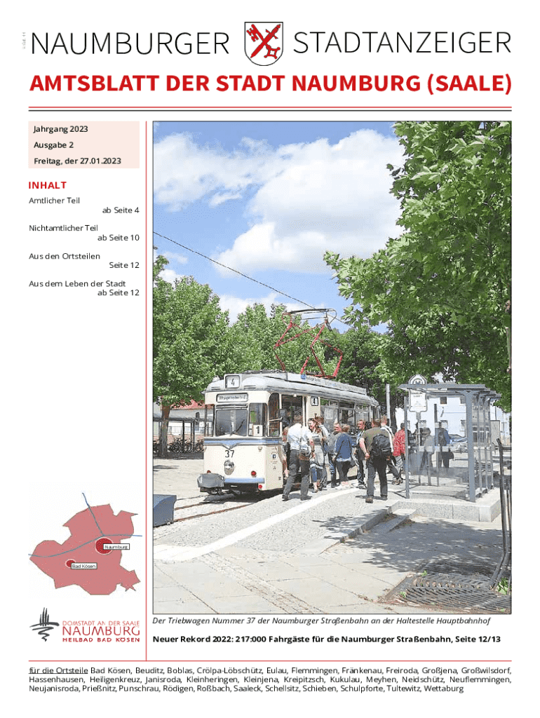 PA smtl. HHNAUMBURGERSTADTANZEIGERAMTSBLATT DER STADT NAUMBURG (SAALE) Jahrgang 2023 Ausgabe 2 Freitag, der 27.01.2023INHALT Amtlicher Teil ab Seite 4Nichtamtlicher Teil ab Seite 10 Aus den Ortsteilen