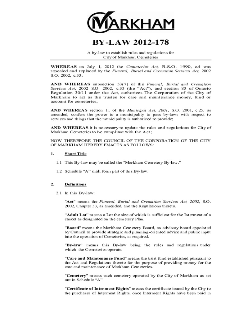 BYLAW 2012178 A bylaw to establish rules and regulations for City of Markham Cemeteries WHEREAS on July 1, 2012 the Cemeteries Act, R.S.O. 1990, c.4 was repealed and replaced by the Funeral, Burial