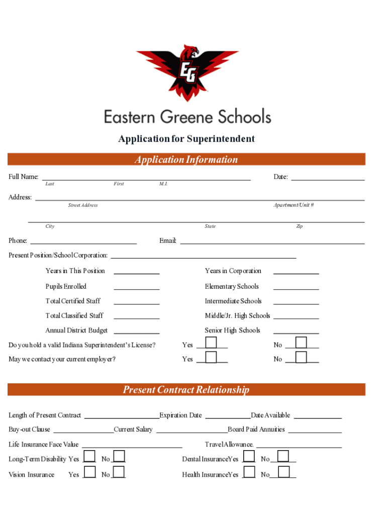 This document outlines the application process for candidates seeking the position of Superintendent at Eastern Greene Schools. It includes sections for personal information, professional experience, educational background, and specific application questions aimed at assessing the candidates\' qualifications, vision, and community involvement strategies. Additionally, it requires disclosures regarding background information and an understanding of the non-discrimination policy of the...