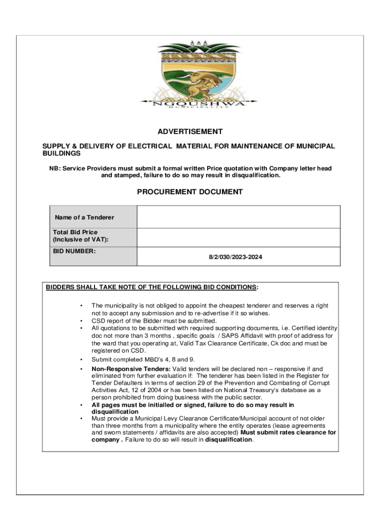 ADVERTISEMENT SUPPLY & DELIVERY OF ELECTRICAL MATERIAL FOR MAINTENANCE OF MUNICIPAL BUILDINGS NB: Service Providers must submit a formal written Price quotation with Company letter head and stamped,