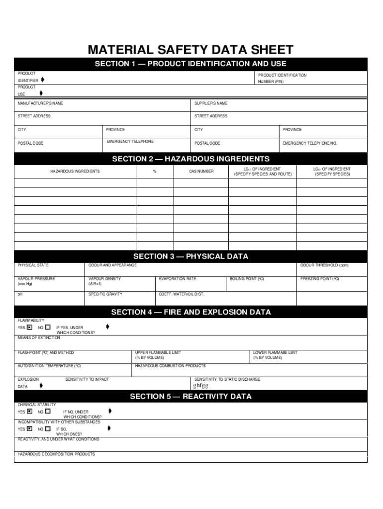 MATERIAL SAFETY DATA SHEET SECTION 1 PRODUCT IDENTIFICATION AND USE PRODUCT IDENTIFIER PRODUCTPRODUCT IDENTIFICATIONNUMBER (PIN)USEMANUFACTURER\'S NAMESUPPLIERS NAMESTREET ADDRESSSTREET ADDRESSCITYPROVINCECITYPROVINCEPOSTAL