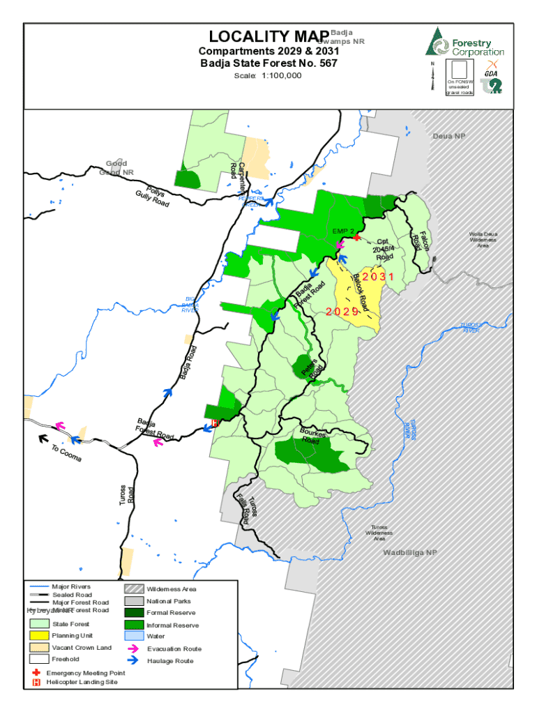 Badja LOCALITY MAP Swamps NRCompartments 2029 & 2031 Badja State Forest No. 567Scale: 1:100,000 3 2On FCNSW unsealed gravel roadsDeua NPGood Good NRPEPPERS CREEKEMP 2Woila Deua Wilderness AreaG2031