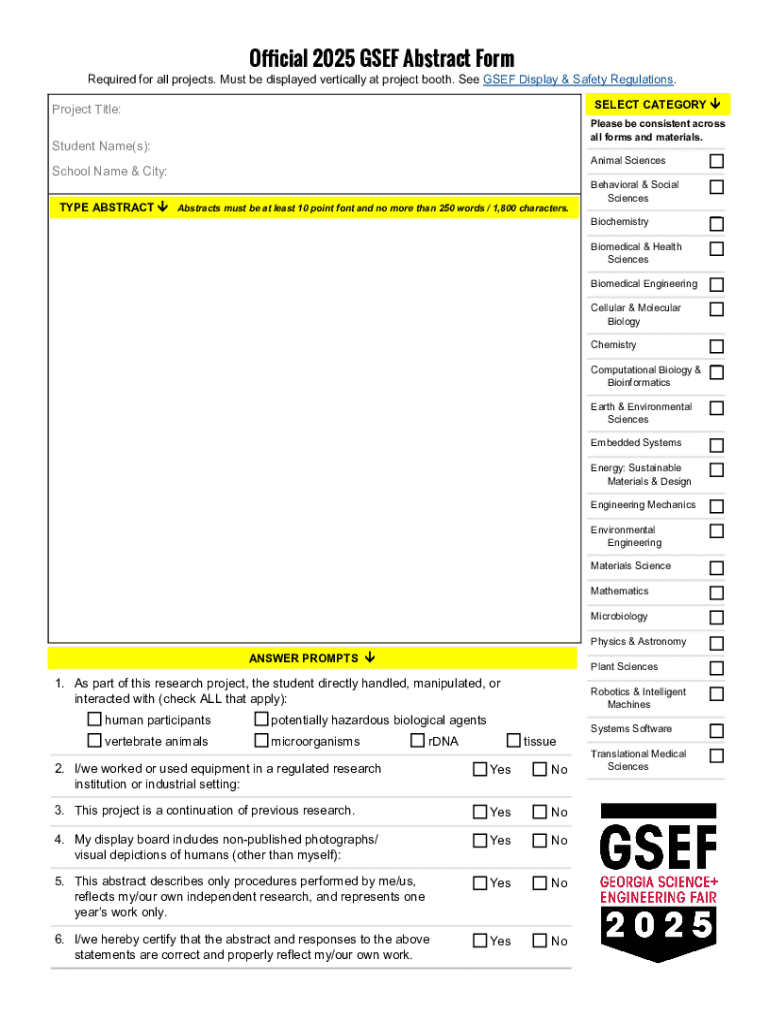 Official 2025 GSEF Abstract FormRequired for all projects. Must be displayed vertically at project booth. See GSEF Display & Safety Regulations. SELECT CATEGORY Project Title:Please be consistent