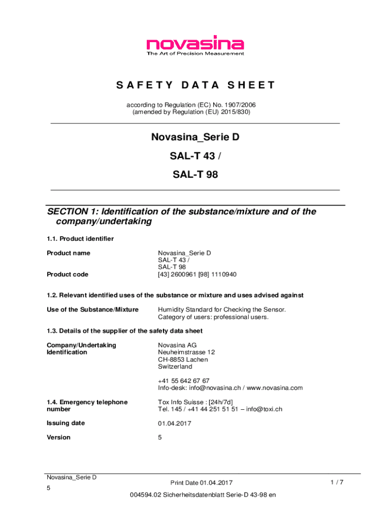 Get the free Novasina_serie D Sal-t 43 / Sal-t 98 Safety Data Sheet
