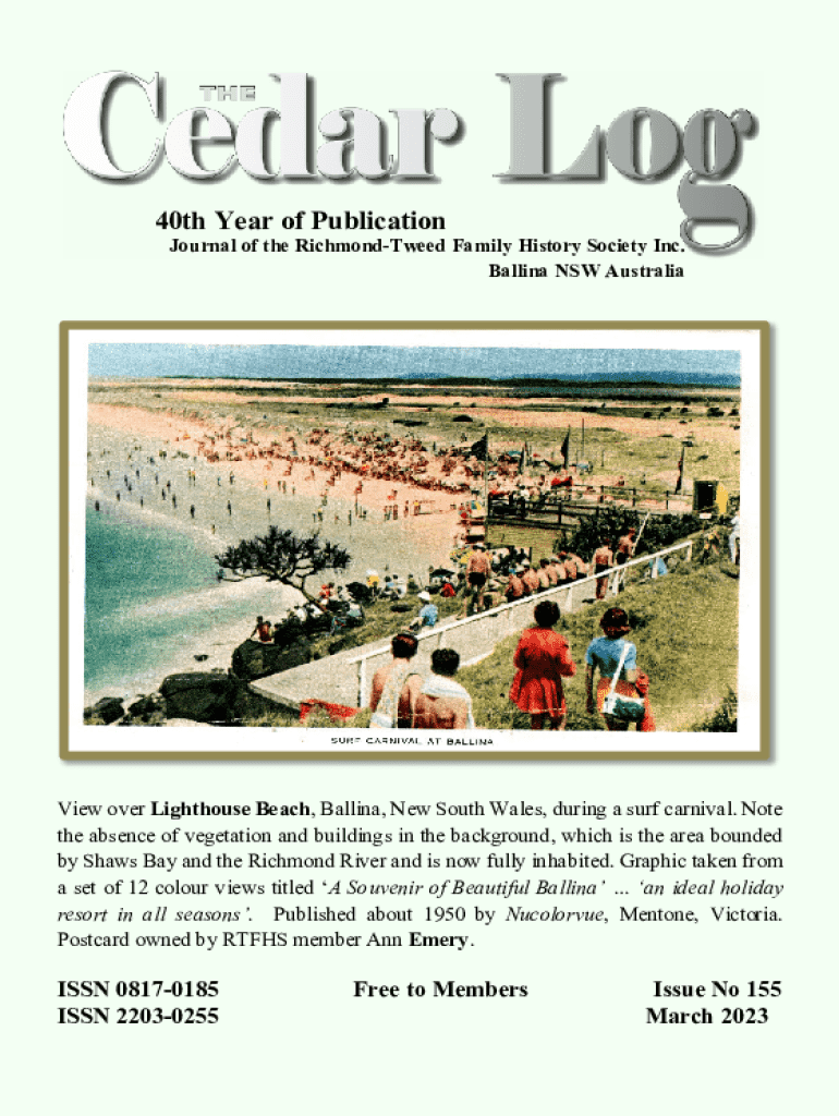 This journal celebrates the 40th year of the Richmond-Tweed Family History Society and provides updates on society activities, member contributions, articles on family history research, and highlights from local historical resources. It includes details about upcoming events, features on ancestors, and information about family history resources available at the Marie Hart Library.