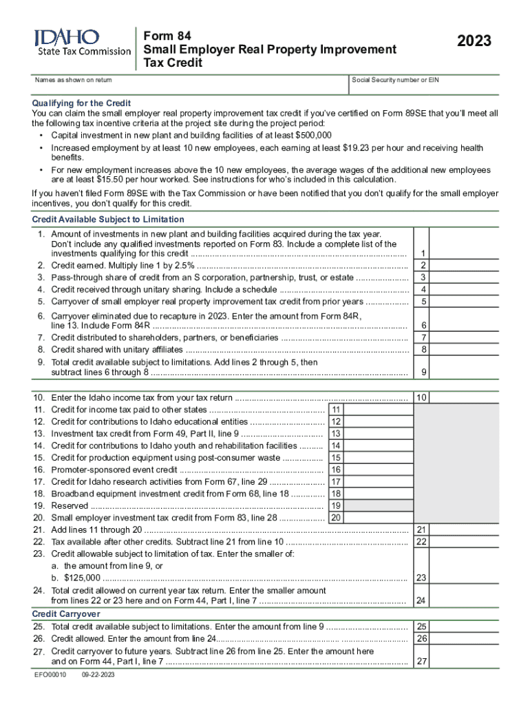 This form is used to calculate the Idaho small employer real property improvement tax credit, which allows qualifying employers to claim a credit for capital investments in new plant and building facilities that meet specific employment and wage criteria. It details the requirements for eligibility, the calculation of potential credits, and the instructions for filing, including carryover provisions and limitations.