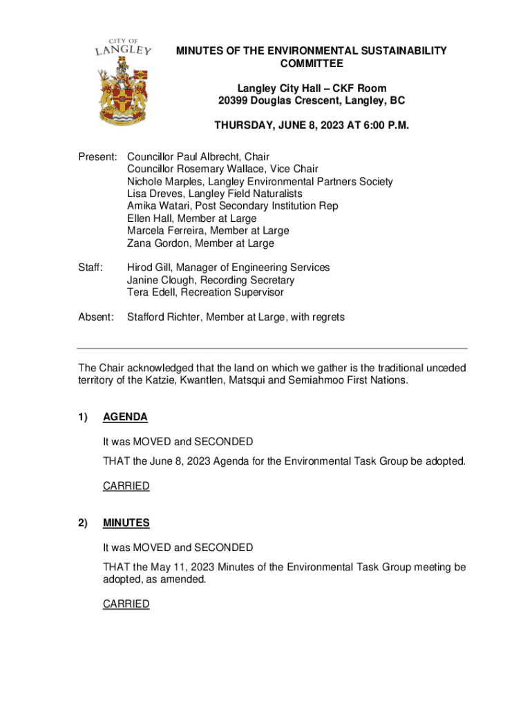 Minutes from the Environmental Sustainability Committee meeting held on June 8, 2023, at Langley City Hall. The document outlines the agenda, discussions, actions, and presentations regarding various environmental programs, activities, and updates related to the city’s sustainability initiatives.