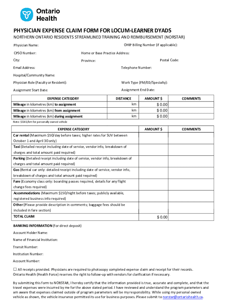 The physician expense claim form is a document used by healthcare professionals to request reimbursement for expenses incurred while providing medical services.
