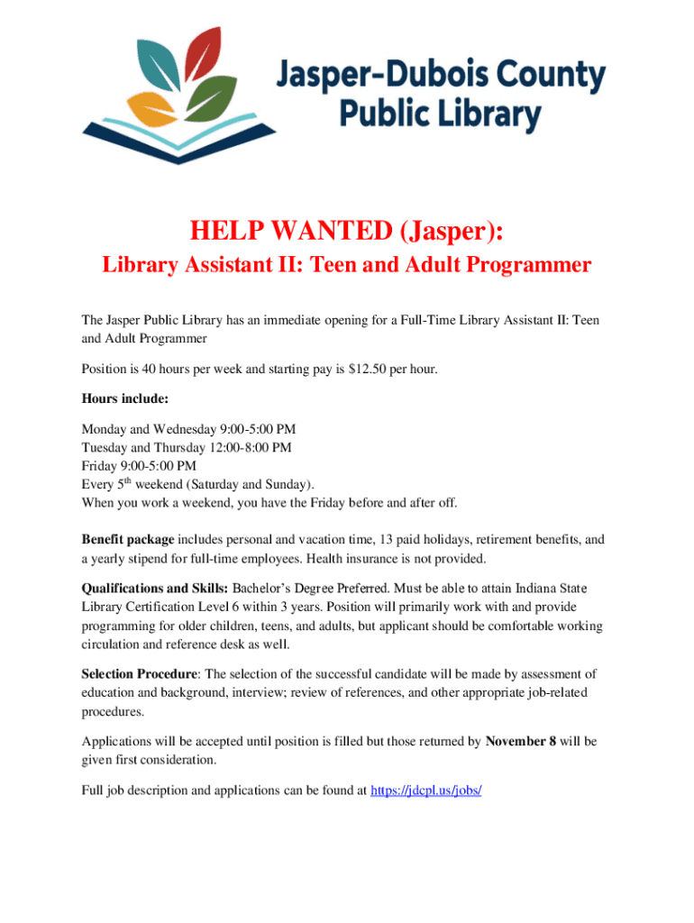 Get the free Library Assistant Ii: Teen and Adult Programmer