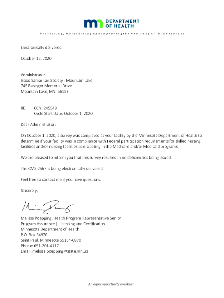This document outlines the results of a survey conducted by the Minnesota Department of Health to evaluate compliance with Federal regulations for skilled nursing facilities. The survey indicated that the facility was in full compliance with no deficiencies reported.