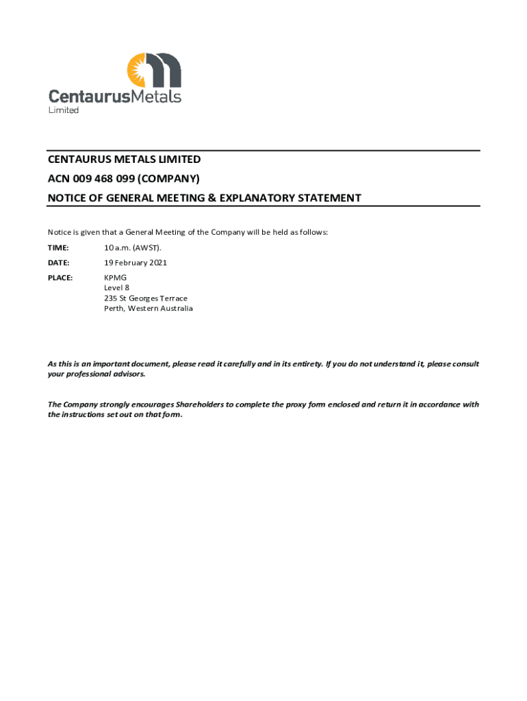This document serves as a notice for the General Meeting of Centaurus Metals Limited, outlining the meeting agenda, resolutions to be voted on, and other key details including COVID-19 protocols, shareholder instructions, and background information on the resolutions regarding share placements and options.
