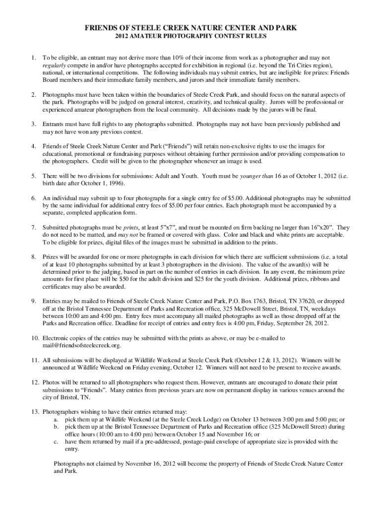 This document outlines the rules and application process for the 2012 Amateur Photography Contest hosted by the Friends of Steele Creek Nature Center and Park. It details eligibility requirements, submission guidelines, judging criteria, prize distribution, and the process for returning submitted photographs.