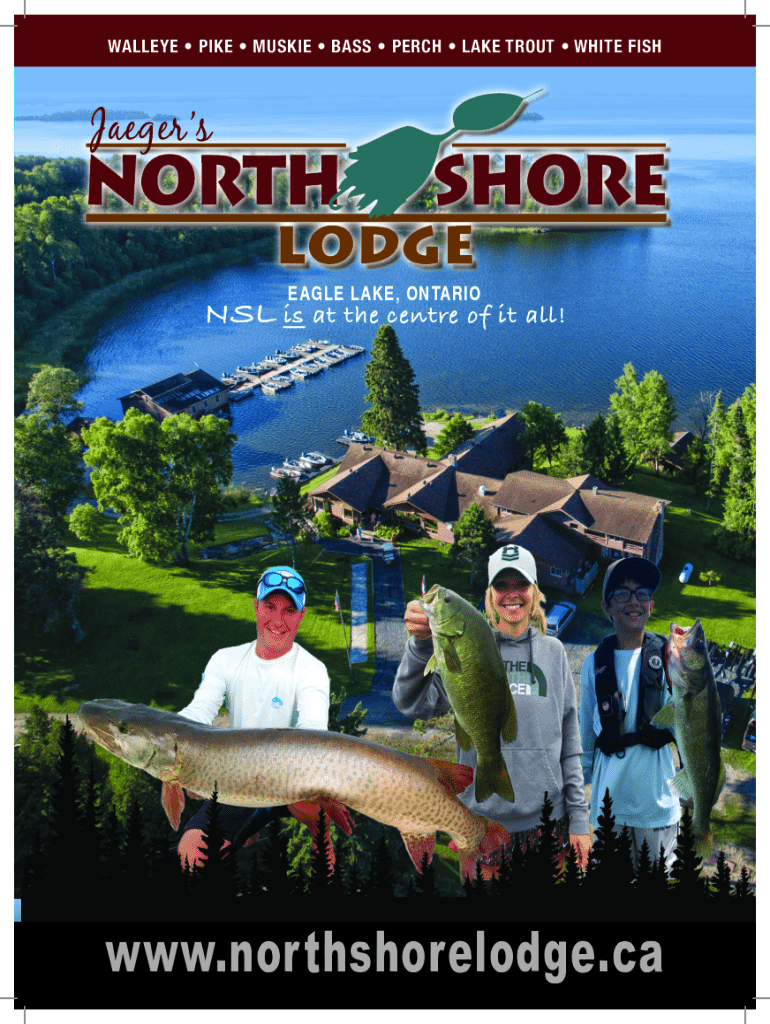 WALLEYE PIKE MUSKIE BASS PERCH LAKE TROUT WHITE FISHJaegersEAGLE LAKE, ONTARIONSL is at the centre of it all!www.northshorelodge.caNORTH SHORE LODGEis at the centre of this Northern Ontario fishing