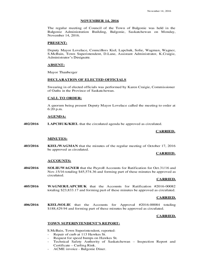 November 14, 2016NOVEMBER 14, 2016 The regular meeting of Council of the Town of Balgonie was held in the Balgonie Administration Building, Balgonie, Saskatchewan on Monday, November 14, 2016. PRESENT: