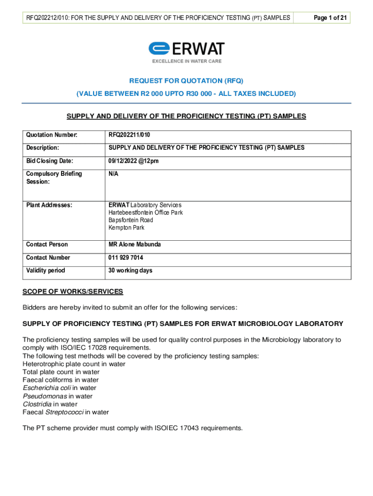 This document is a Request for Quotation (RFQ) for the supply and delivery of proficiency testing samples for quality control purposes in the microbiology laboratory, in compliance with ISO/IEC 17028 requirements. It details the scope of work, eligibility criteria, submission requirements, and evaluation criteria for bidders.