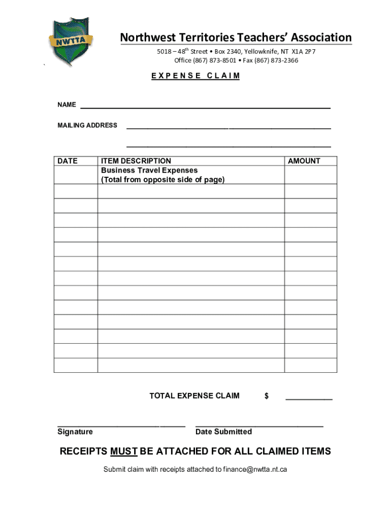 Northwest Territories Teachers Association 5018 48th Street Box 2340, Yellowknife, NT X1A 2P7 Office (867) 8738501 Fax (867) 8732366`EXPENSE CLAIMNAME___MAILING ADDRESS___ ___DATEITEM DESCRIPTION