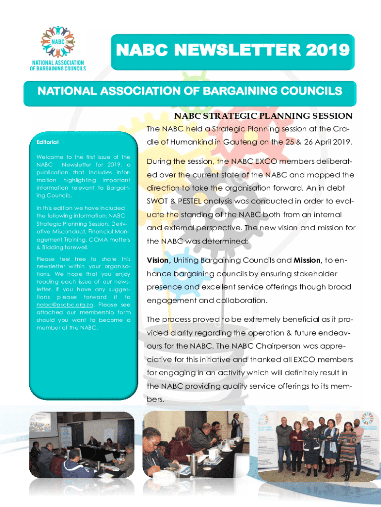 The first issue of the 2019 NABC Newsletter provides insights into the National Association of Bargaining Councils\' strategic planning session, discusses derivative misconduct, highlights a financial management training course, and includes information on how companies can support employee education. Additionally, it acknowledges the contribution of Mr. Tom Mkhwanazi, who has transitioned to CEO of W&RSETA.