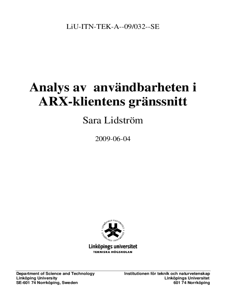 LiUITNTEKA09/032SEAnalys av anvndbarheten i ARXklientens grnssnitt Sara Lidstrm 20090604Department of Science and Technology Linkping University SE601 74 Norrkping, SwedenInstitutionen fr teknik och