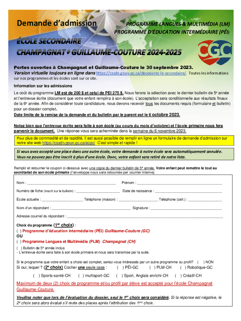 Demande dadmissionPROGRAMME LANGUES & MULTIMDIA (LM) PROGRAMME DDUCATION INTERMDIAIRE (PI)Portes ouvertes Champagnat et GuillaumeCouture le 30 septembre 2023. Version virtuelle toujours en ligne dans