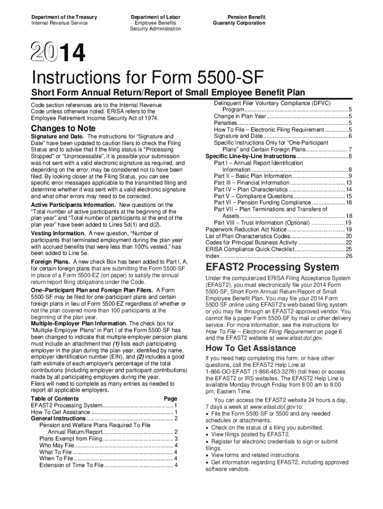 This document provides instructions for filing Form 5500-SF, an annual return/report for small employee benefit plans. It outlines eligibility criteria, filing requirements, and penalties for non-compliance under ERISA. The form collects information on active participants, plan assets, liabilities, and compliance with federal regulations.