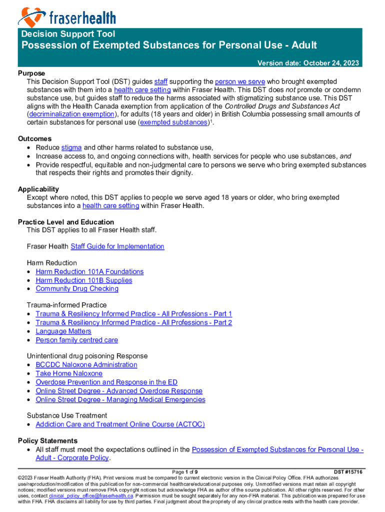 Decision Support ToolPossession of Exempted Substances for Personal Use Adult Version date: October 24, 2023 Purpose This Decision Support Tool (DST) guides staff supporting the person we serve who
