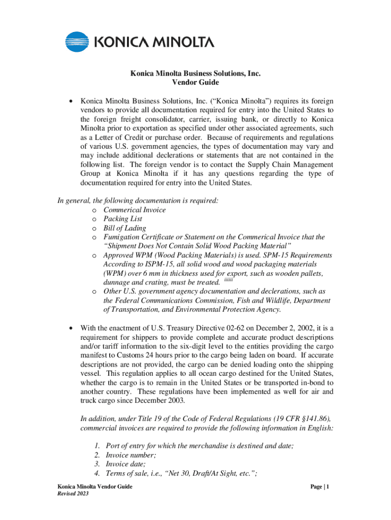 This document outlines the requirements and guidelines for foreign vendors partnering with Konica Minolta Business Solutions, Inc. It includes information on the necessary documentation for shipping to the U.S., security protocols for container shipments, compliance with labor and employment standards, and environmental considerations, as well as policies regarding human rights and anti-corruption practices.