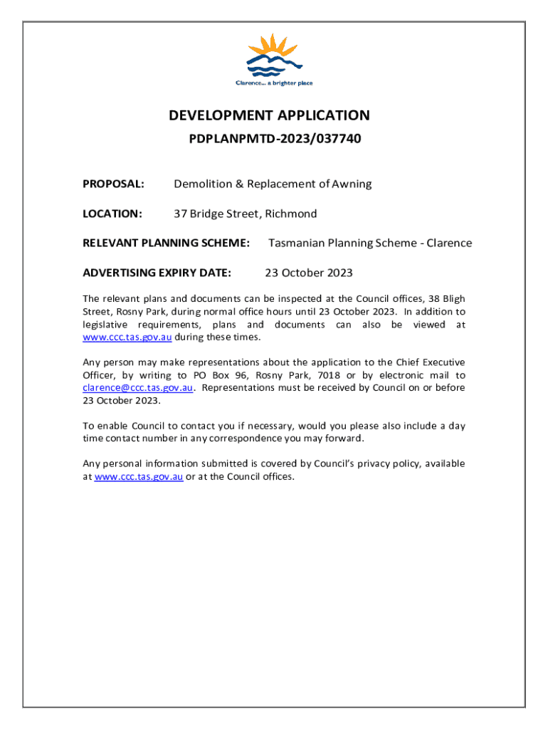This document outlines a development application for the demolition and replacement of an awning at 37 Bridge Street, Richmond, under the Tasmanian Planning Scheme - Clarence. It includes information about the proposal\'s details, location, relevant planning scheme, advertising expiry date, and the process for public representation and consideration.