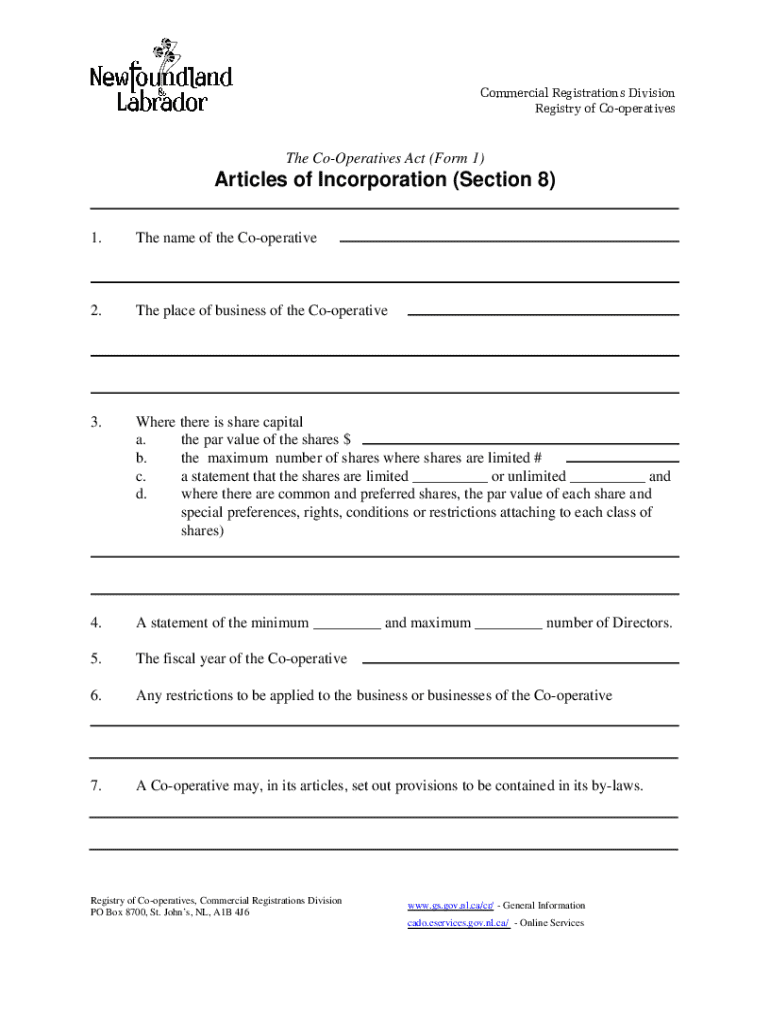 This form is used for the registration of a co-operative under the Co-Operatives Act, detailing essential information such as the name, location, share capital, directors, fiscal year, business restrictions, and objects of the co-operative. It must be accompanied by additional forms and documents.