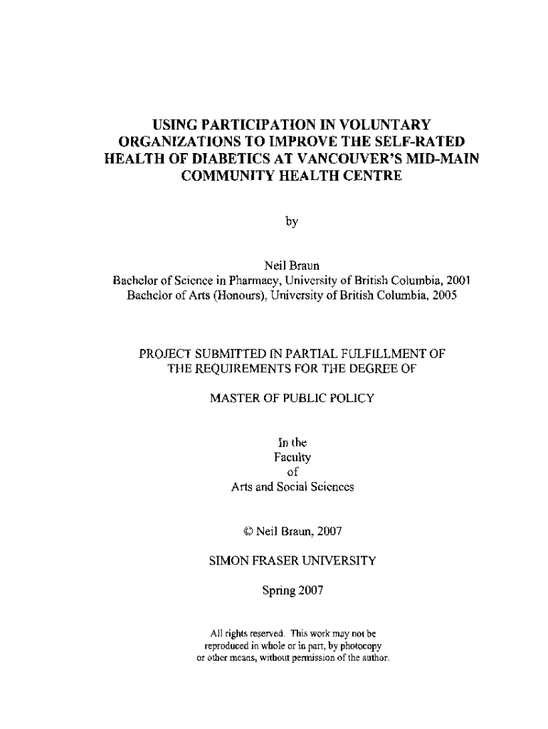 USING PARTICIPATION IN VOLUNTARY ORGANIZATIONS TO IMPROVE THE SELFRATED HEALTH OF DIABETICS AT VANCOUVER\'S MIDMAIN COMMUNITY HEALTH CENTRENeil Braun Bachelor of Science in Pharmacy, University of