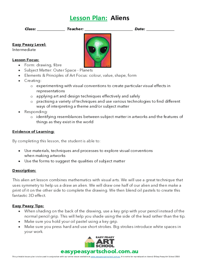 Lesson Plan: Aliens Class: ___ Teacher: ___ Date: ___Easy Peasy Level: Intermediate Lesson Focus: Form: drawing, fibre Subject Matter: Outer Space Planets Elements & Principles of Art Focus: colour,